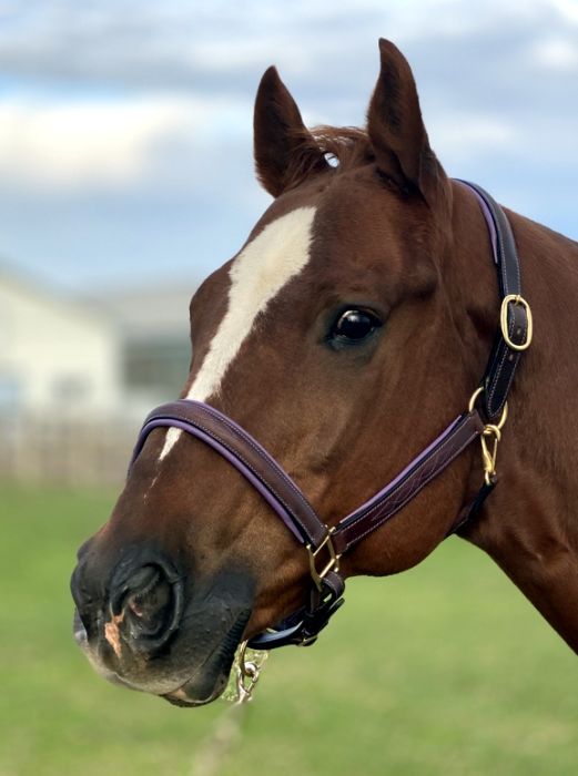 Padded and stitched nose. Padded crown and flat cheek pieces, perfect for adding a name plate. Heavy Duty square hardware and snap.