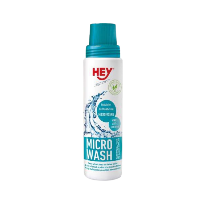 HEY SPORT® Micro Wash cleans and also preserves the function of textiles made of microfiber and fleece. It restores the original fiber structure and thus makes it possible for body moisture to be wicked away to the outside. HEY SPORT® Micro Wash is kind to textiles and colours. In addition it contains an antistatic formula. Special additives neutralize bad smells.