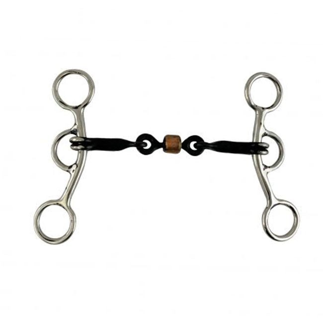 Showman ® stainless steel JR Cowhorse bit with 5-1/2" shanks, 5" sweet iron 3 piece snaffle with a center dog bone and copper roller. Made by Showman Products.