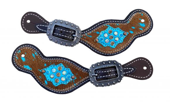 Showman ® Ladies Cowhide spur straps with teal acid wash accent, featuring a teal leather patch adorned with rhinestones. Features engraved vintage silver buckles.