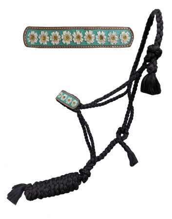 Showman® Woven black nylon mule tape halter with hand painted flower accent with teal inlay on the noseband. This mule tape style halter features woven nylon with a removable 8' lead. Features a leather noseband with hand painted flower accent with a teal inlay. This halter as tassel ends at the tie point and tassels on the removable lead. Halter is lightweight and excellent for groundwork or any other in-hand training.