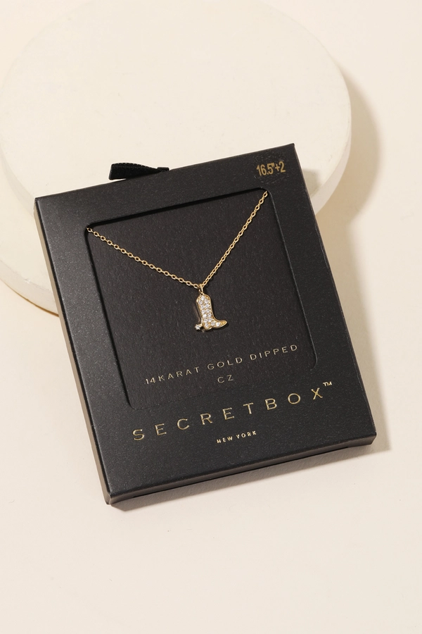 A gorgeous unique must have trending gold dipped necklace that is made with a secret box pave cowboy boot pendant necklace design. Fits beautifully well in any scenario!