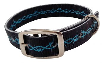 Showman Couture ® Black with Barbwire design nylon dog collar. Durable flat 2ply nylon with nickel plated buckle and D ring to easily attach a leash.