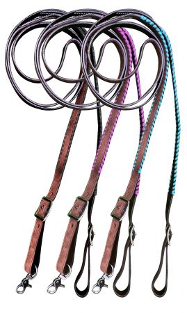 Showman ® Rawhide laced Argentina leather contest rein with a scissor snap end.