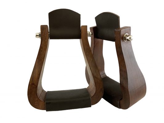 Showman ® Teak Wood stirrup with leather foot pad. This medium colored teak wood stirrup features a chocolate leather accent.