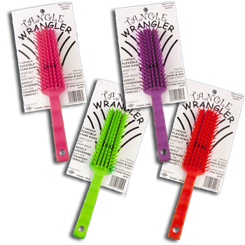 Flexible 7 row detangling brush in assorted neon pink, purple, orange and green.