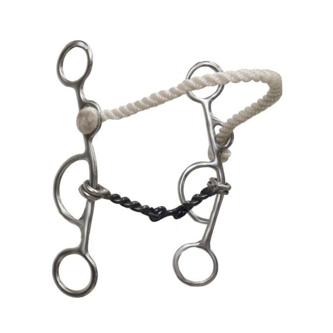 Showman ® stainless steel combination bit with rope nose. This bit features stainless steel cheeks with sliding twisted sweet iron mouth with center dog bone and a wax covered twisted rope nose.