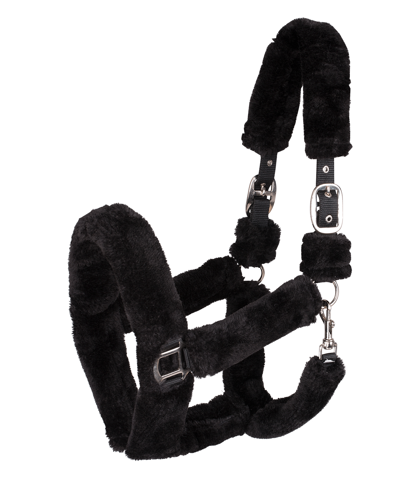 Quality Nylon halter fully covered with soft synthetic fur. Really good for sensitive horses e.g. when being transported. Adjustable both sides on headpiece.